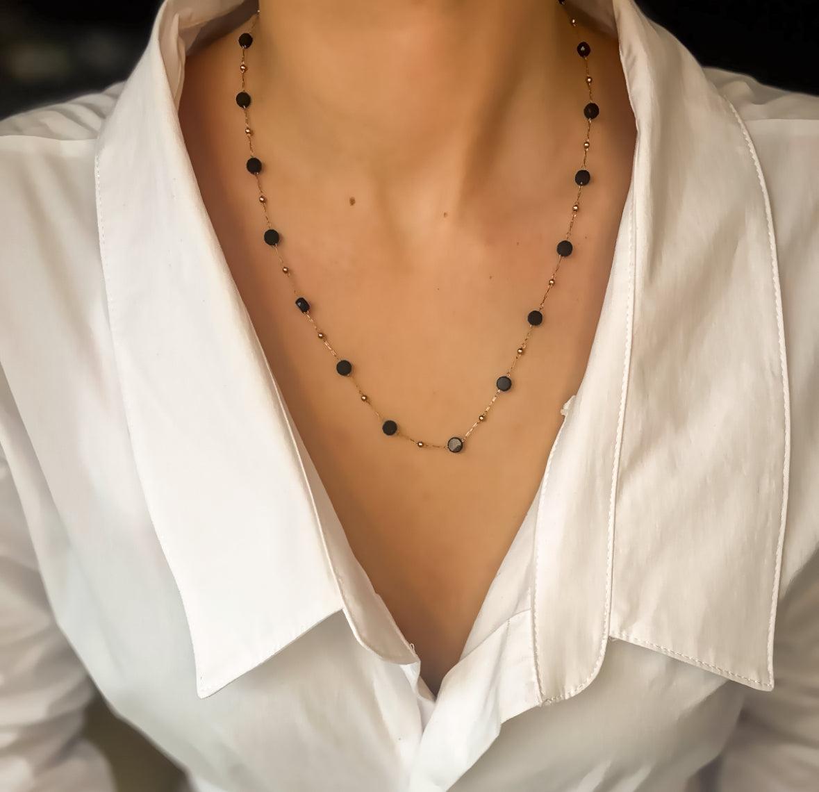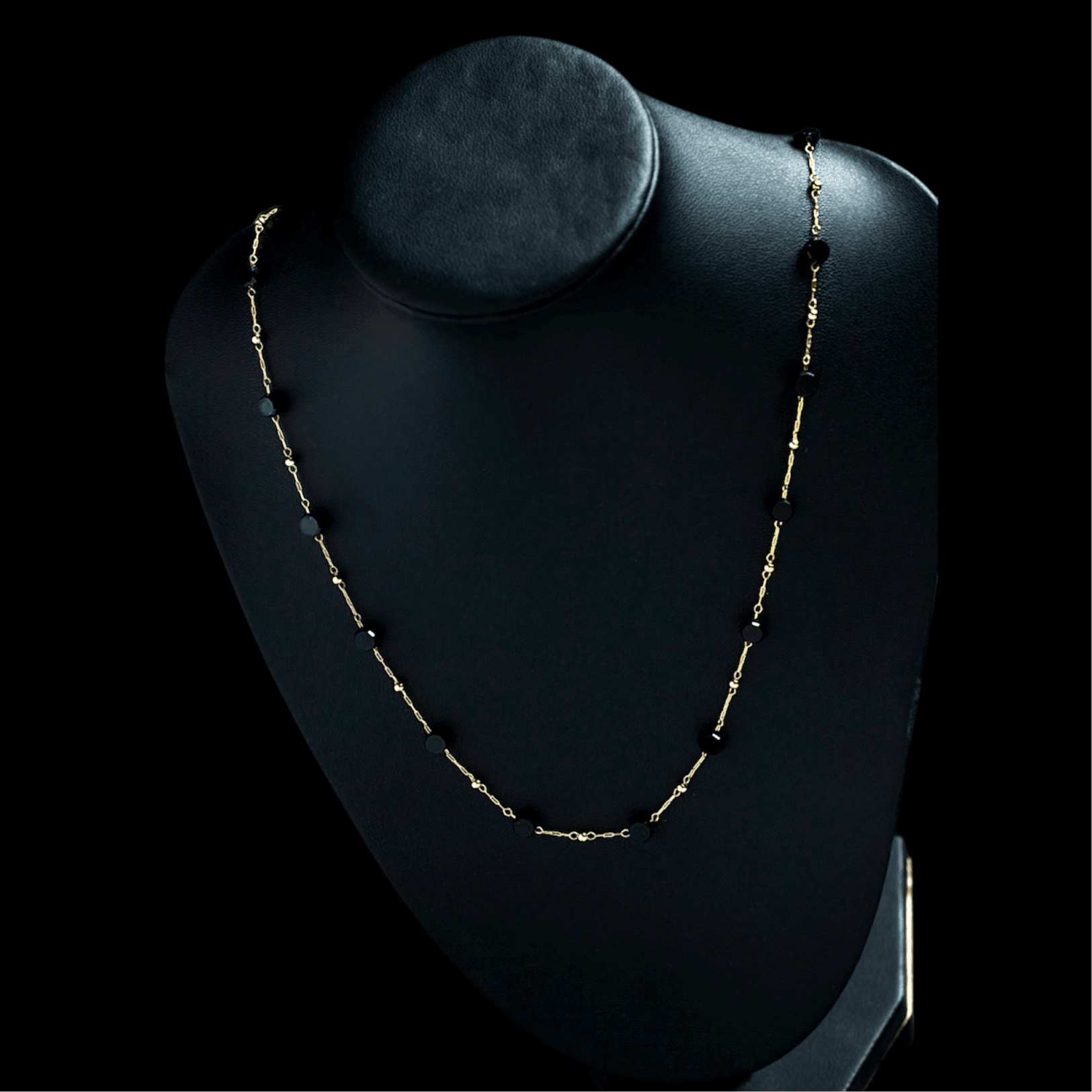 A striking rosary with black beads, a symbol of spirituality and mysticism. Its elegant design carries a timeless aesthetic, inspired by the serenity of the night.